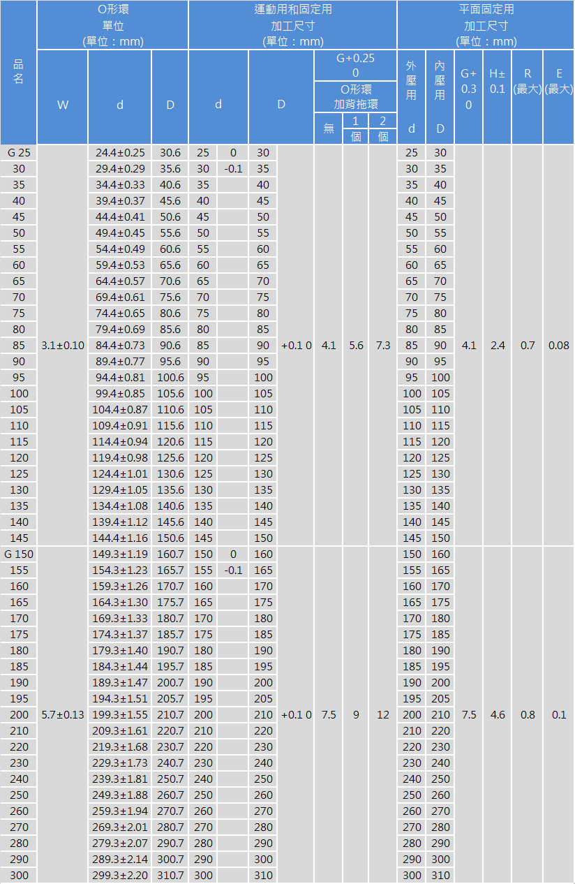 O形圈尺寸表(JIS B2401-G系列)表準規格